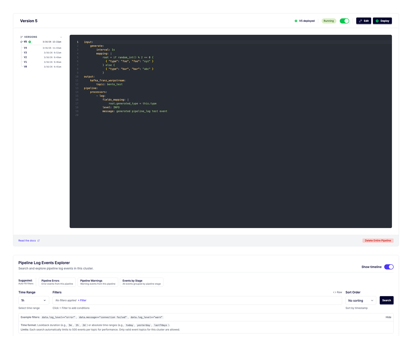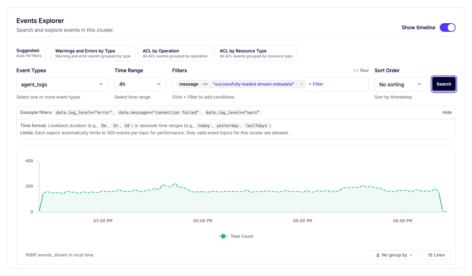 The timeline charts event volume over time, making it easy to spot patterns, for example an error spike after a deploy, periodic ACL denials, a gradual uptick in pipeline failures. You can group by any field in each event’s payload. Group Agent logs by <span class="codeinline">data.log_level</span> to see how the error-to-warning ratio shifts over time, or group ACL events by <span class="codeinline">data.kafka_principal</span> to see which service accounts generate the most denials.