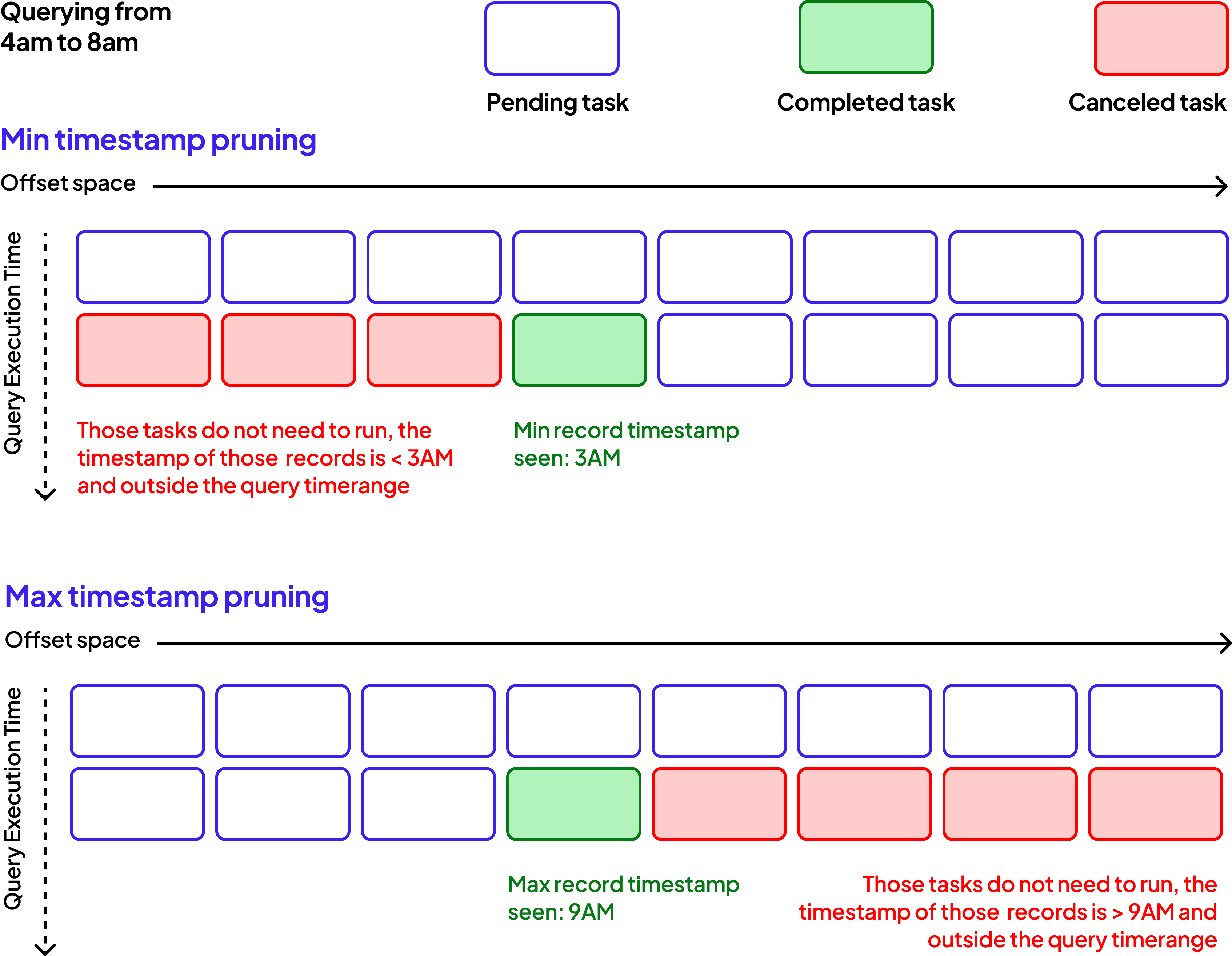 The query engine addresses this with progressive timestamp pruning. As tasks complete, the engine records the actual timestamp ranges observed at each offset range. We call these timestamp watermarks. These watermarks are then used to skip pending tasks whose offset ranges fall entirely outside the query's time filter.